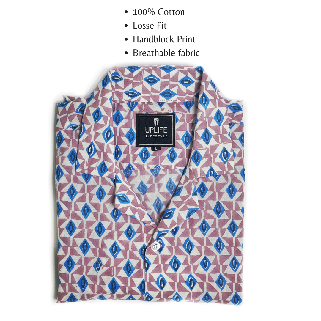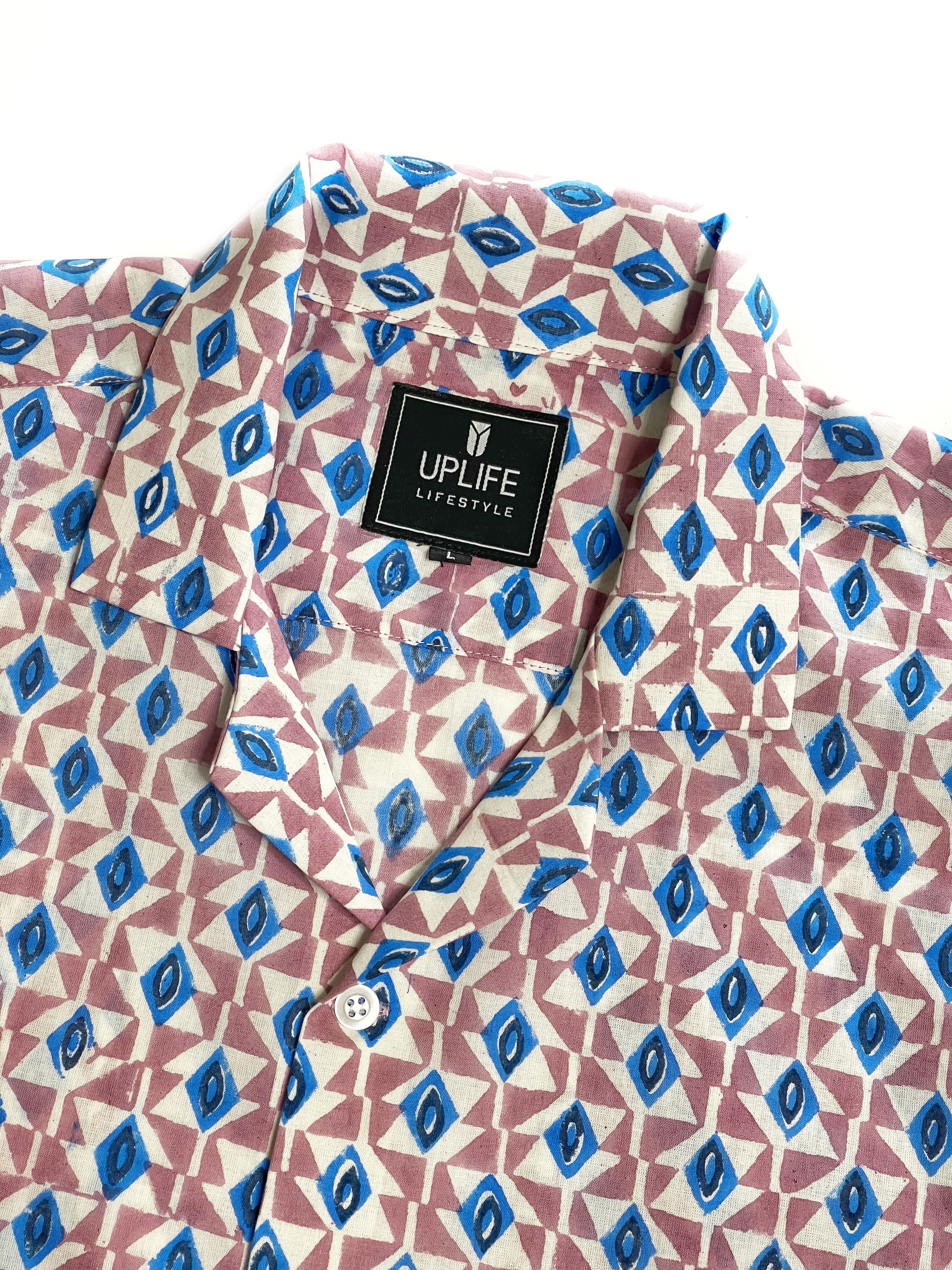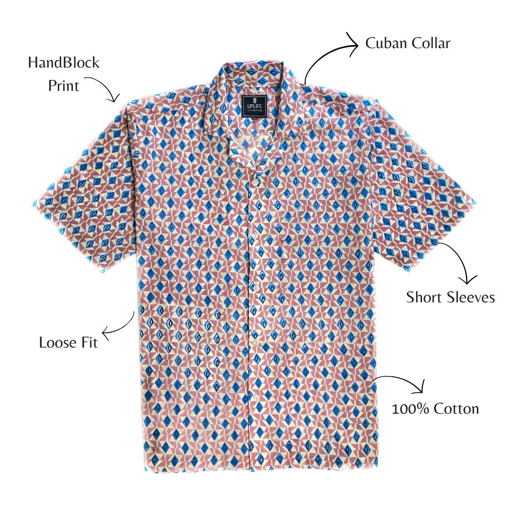 Cuban Collar Shirt with Short Sleeves Handblock Print 100% Cotton